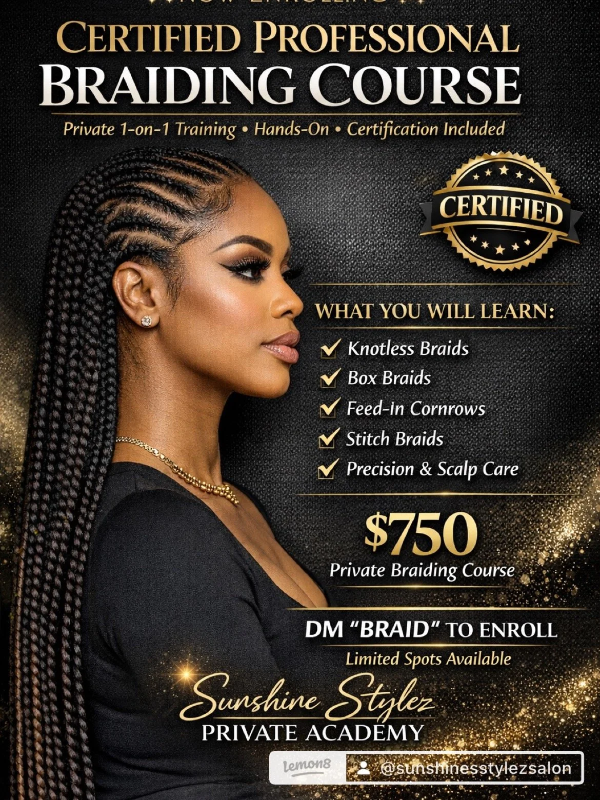 Welcome to a learning space where your passion for braiding is refined into professional skill. Our program is designed to guide you step by step—building strong technique, confidence, and industry readiness. Whether you are just beginning or looking to elevate your craft, you will receive structured education, hands-on training, and certification rooted in professionalism and care.